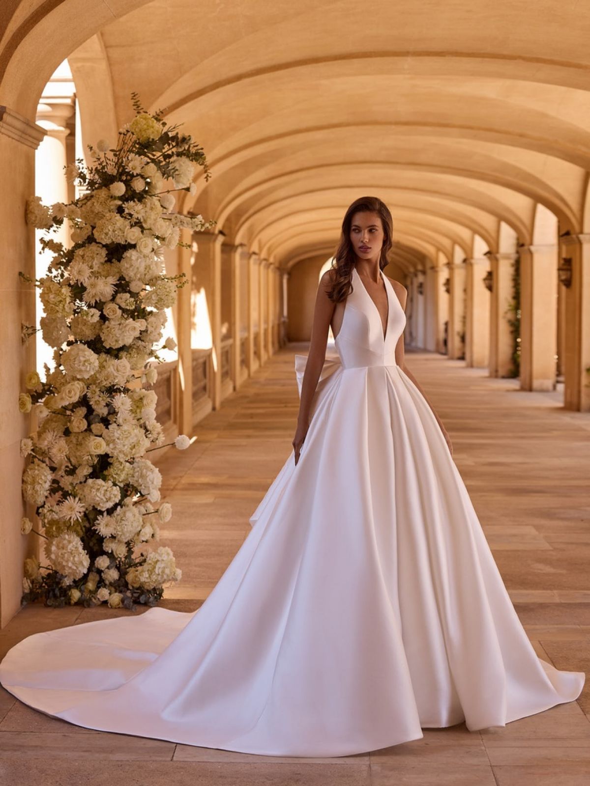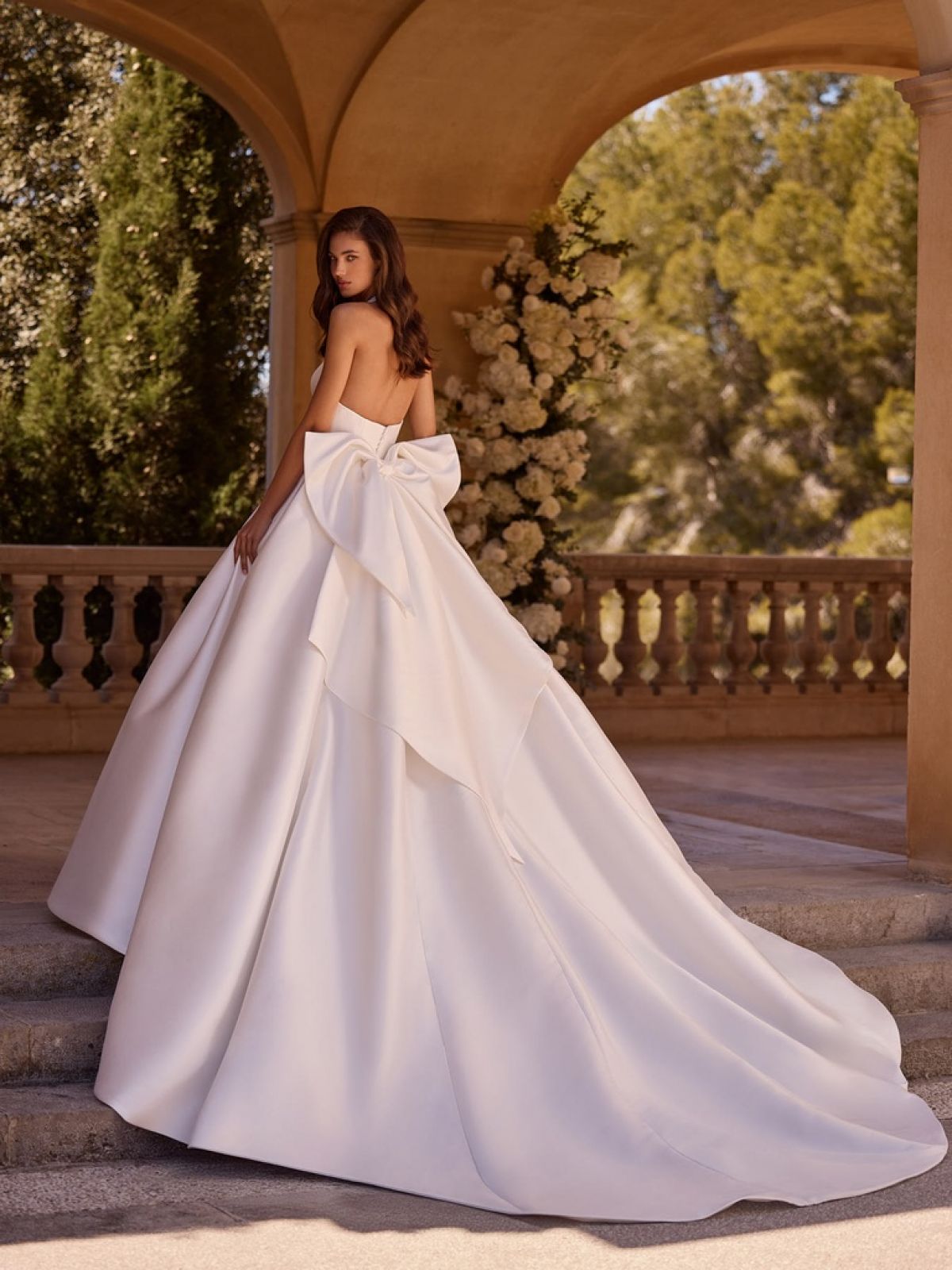 La robe de mariée AMATEA du créateur Alberto Palatchi est une pièce d’exception pensée pour la mariée qui rêve d’une allure princesse moderne, majestueuse et résolument couture. Confectionnée en mikado, une matière noble au tombé structuré et lumineux, AMATE offre une présence spectaculaire dès le premier regard. Son décolleté en V, élégant et parfaitement équilibré, met en valeur le port de tête et la silhouette avec une sophistication naturelle. Le corsage structuré souligne la taille avec précision, tandis que la jupe ample et architecturée déploie une longue traîne qui accompagne chaque mouvement avec grâce et prestance.La signature de ce modèle : un grand nœud amovible en mikado, sculptural et raffiné, qui transforme instantanément la silhouette. Il crée un effet double look : une allure royale et théâtrale pour la cérémonie, puis une version plus épurée et moderne pour la soirée.