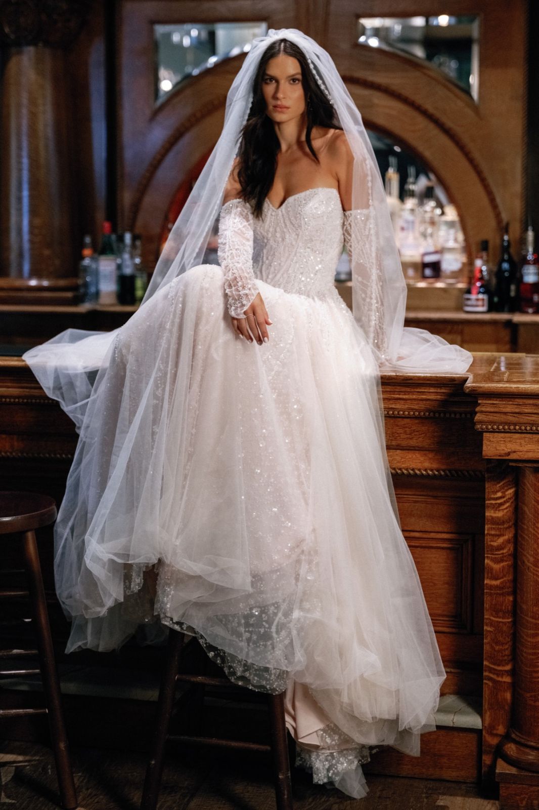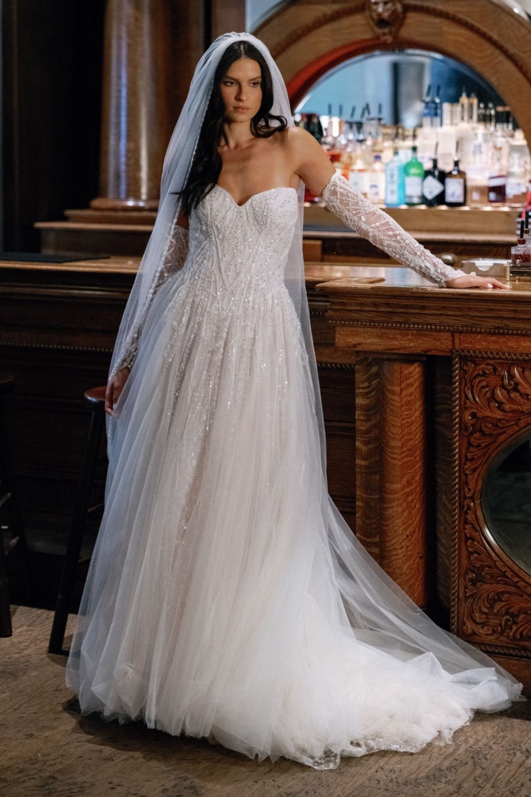 La robe ARISTA révèle une robe bustier cœur au corsage ajusté, entièrement brodé de perles et sequins scintillants. La jupe ample en tulle se déploie en une cascade légère, créant une silhouette flottante et féerique. De dos, la robe dévoile un dos nu subtil, souligné par les détails perlés du corsage et la structure vaporeuse de la jupe. Le tombé est impeccable, la matière capte la lumière avec subtilité. Chaque détail est pensé pour magnifier la mariée dans ses mouvements et ses émotions.