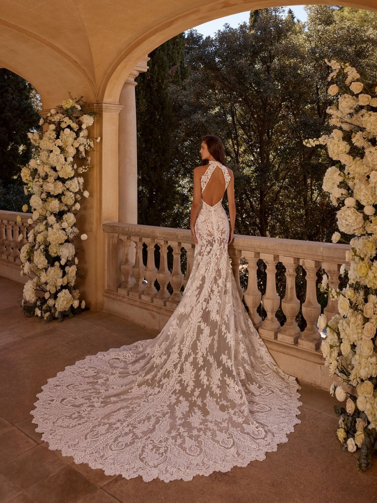 Son décolleté haut en illusion, délicatement orné de motifs floraux, apporte une touche de sophistication intemporelle. Le dos ajouré, signature du créateur, crée un contraste saisissant entre modernité et romantisme. La jupe sirène se prolonge en une traîne spectaculaire, riche en détails, qui capte la lumière et magnifie chaque mouvement. La robe CERES est pensée pour la mariée qui recherche une allure élancée, sensuelle et résolument couture, tout en conservant une douceur romantique. Chaque détail — de la finesse de la dentelle aux lignes parfaitement architecturées — témoigne du savoir‑faire exceptionnel d’Alberto Palatchi.