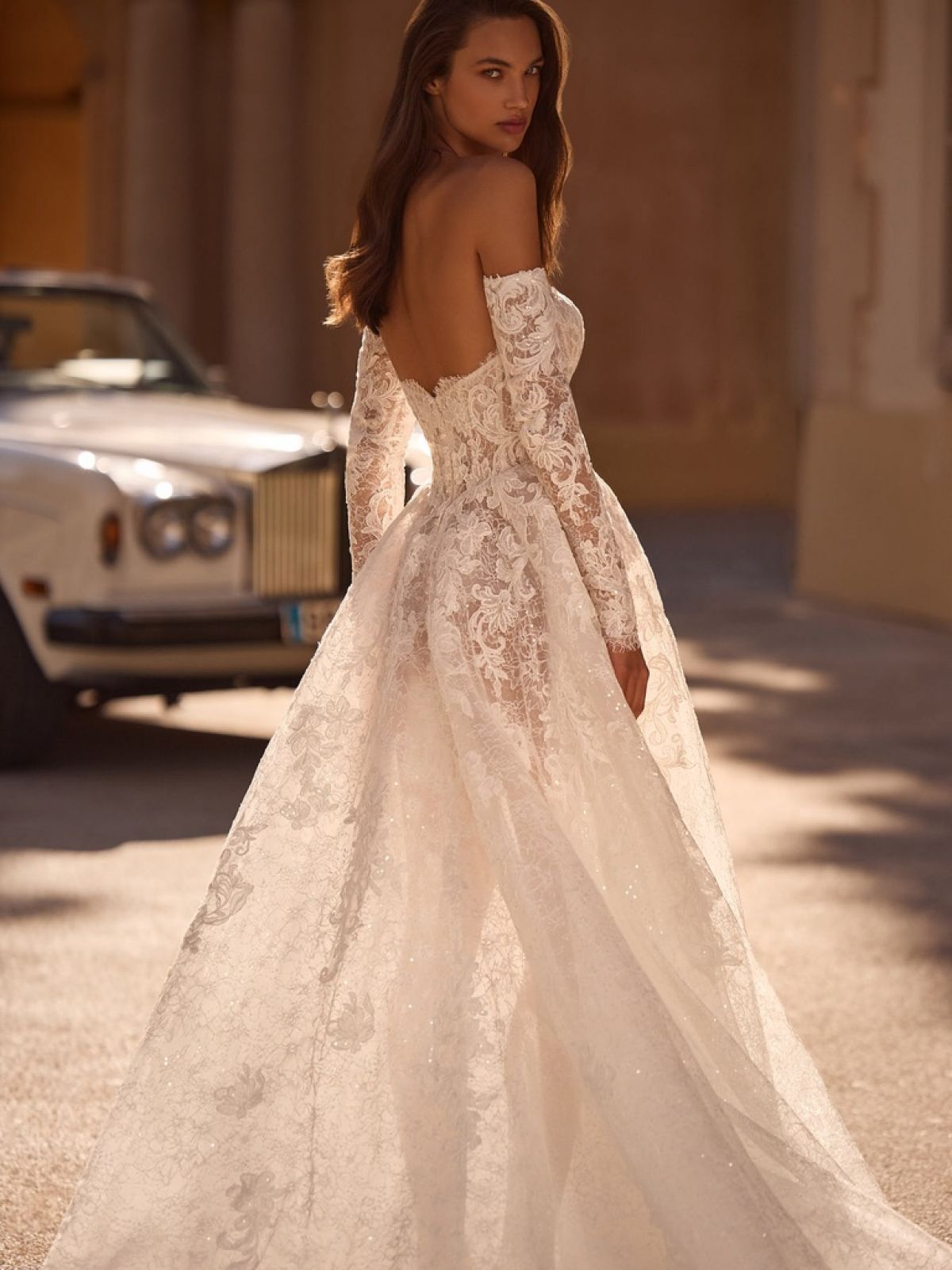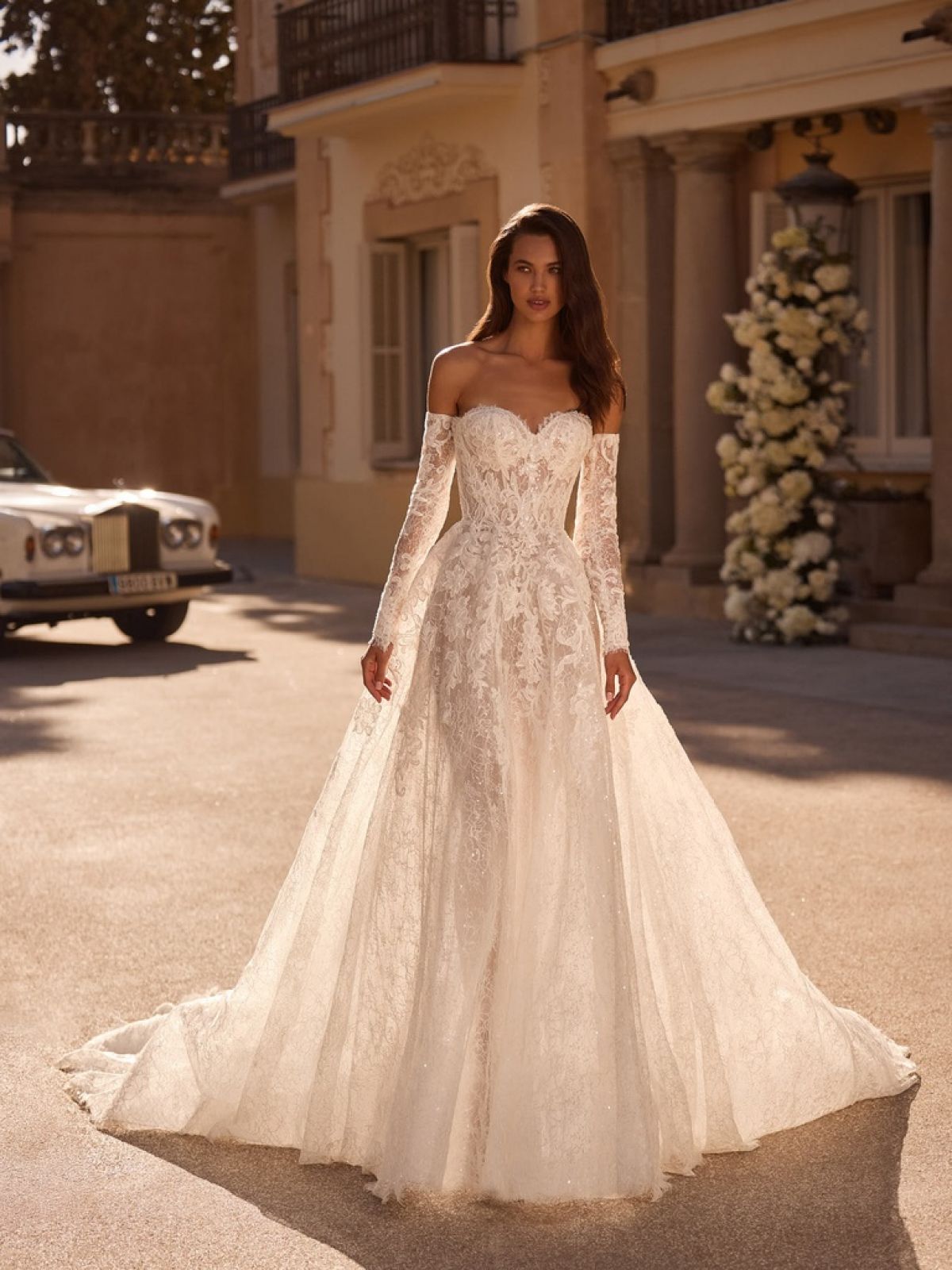 Son décolleté épaules dénudées, soutenu par de longues manches en dentelle transparente, apporte une élégance intemporelle. Le corsage structuré souligne la taille avec subtilité, tandis que la jupe ample et fluide déploie une traîne majestueuse, parfaite pour une entrée de cérémonie inoubliable.