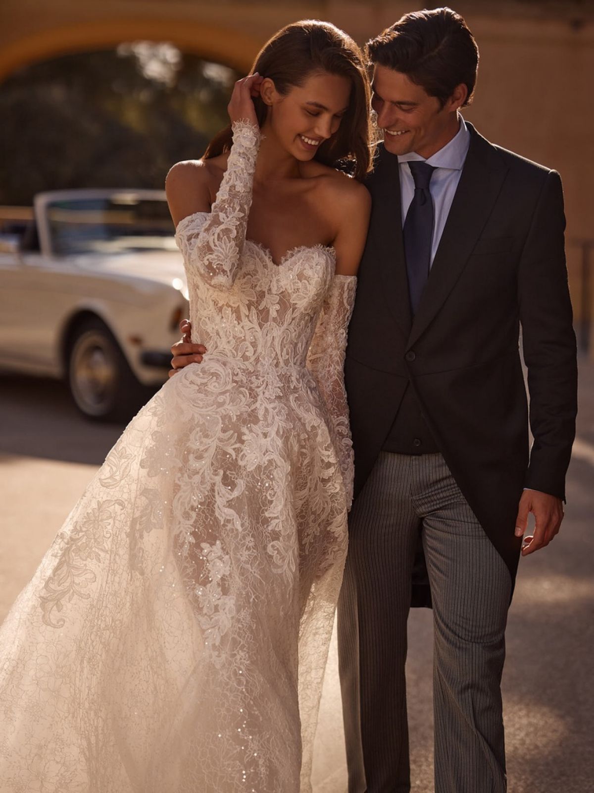 La dentelle de Chantilly, travaillée avec une finesse exceptionnelle, offre un rendu aérien et sophistiqué, tandis que les broderies perlées ajoutent une touche de modernité scintillante.