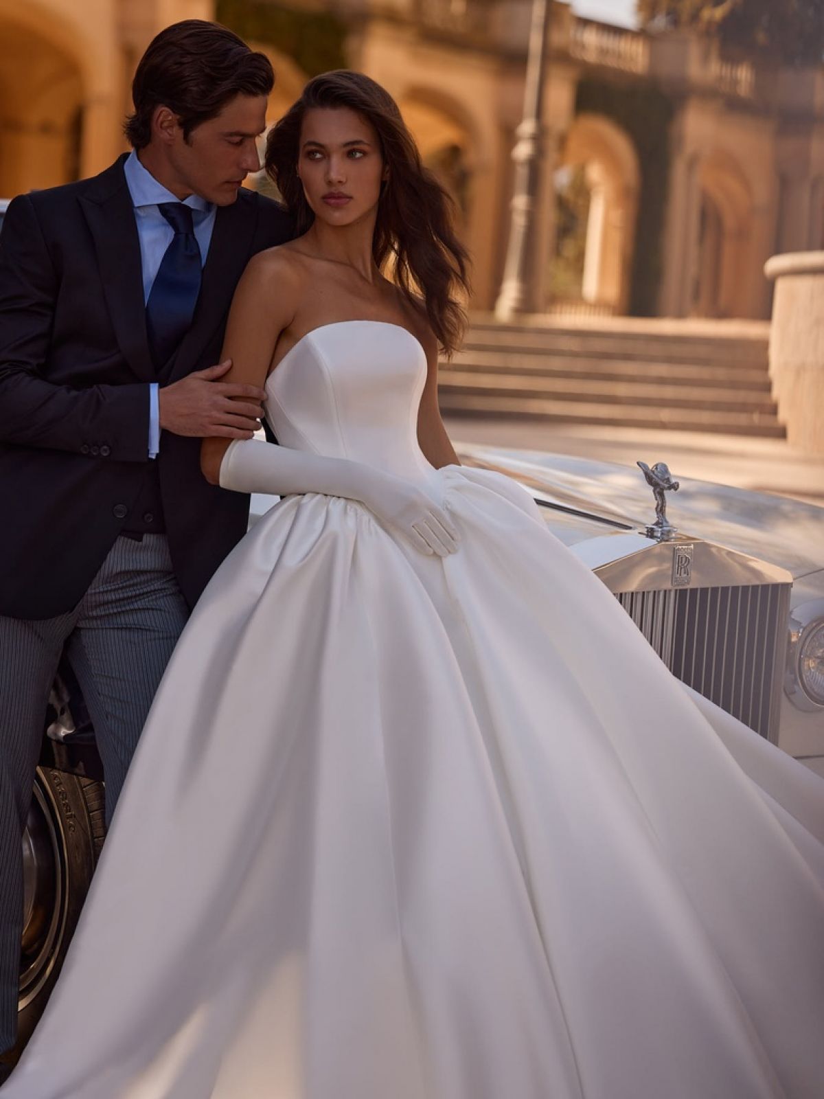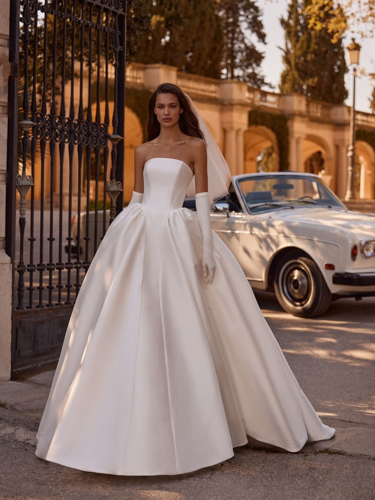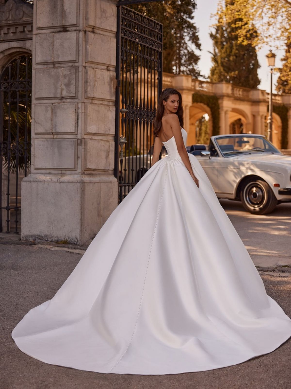 La robe de mariée MELIA du créateur Alberto Palatchi est l’incarnation parfaite du style princesse romantique et classique, pensée pour la mariée qui rêve d’une allure majestueuse, intemporelle et résolument couture. Confectionnée en mikado, une matière noble au tombé structuré et lumineux, MELIA offre une présence spectaculaire dès le premier regard.