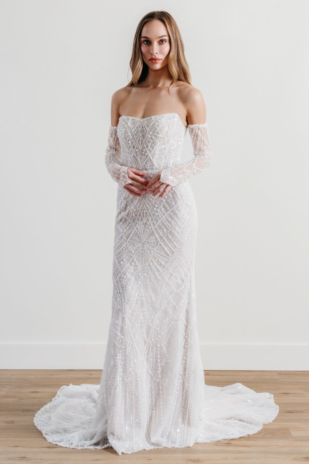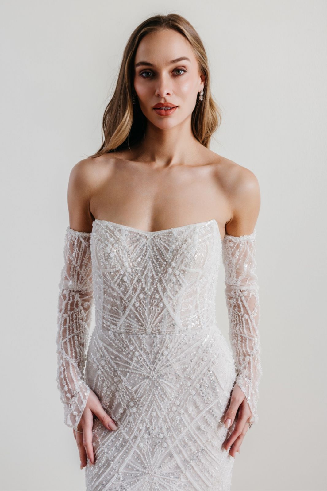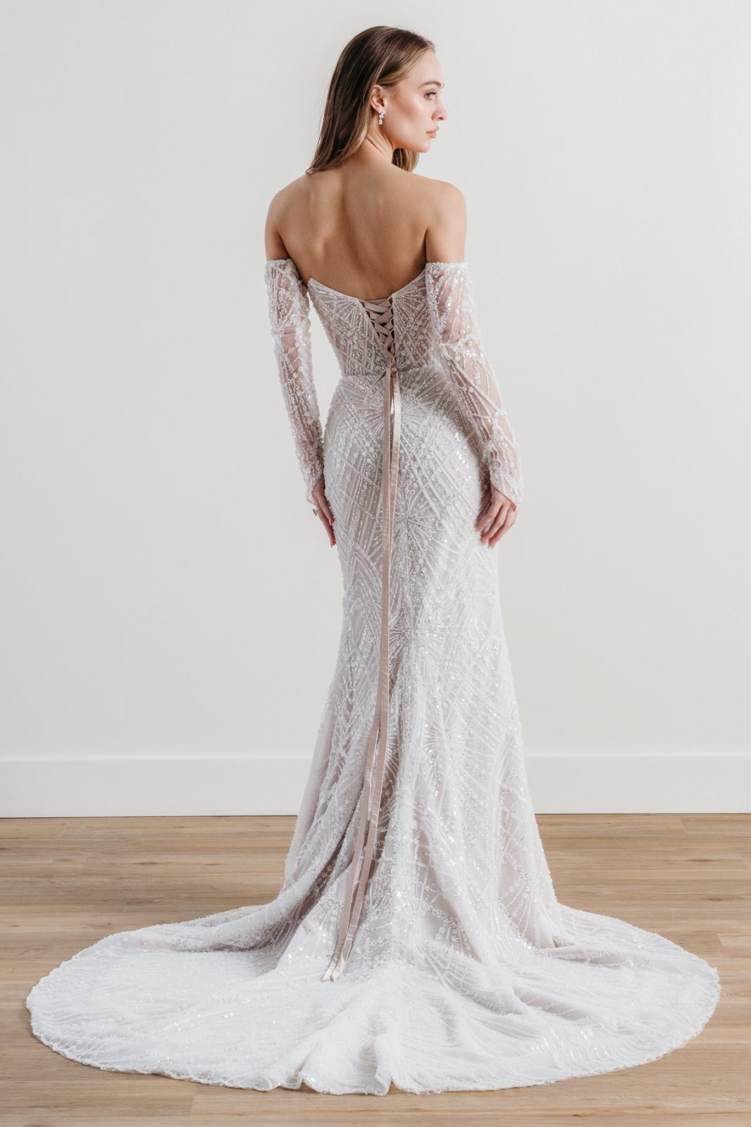 Les atouts de MEMENTO : un bustier off-the-shoulder avec manches longues en tulle brodé, pour une allure romantique et structurée, une dentelle perlée et scintillante, qui capte la lumière et magnifie le mouvement, un dos lacé façon corset, à la fois sensuel et ajustable, offrant un maintien parfait, une coupe fourreau avec légère traîne, idéale pour une démarche assurée et élégante et un tulle illusion avec broderies florales, qui ajoutent profondeur et texture à l’ensemble.