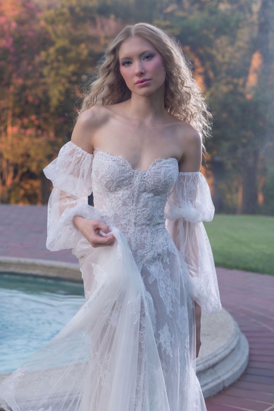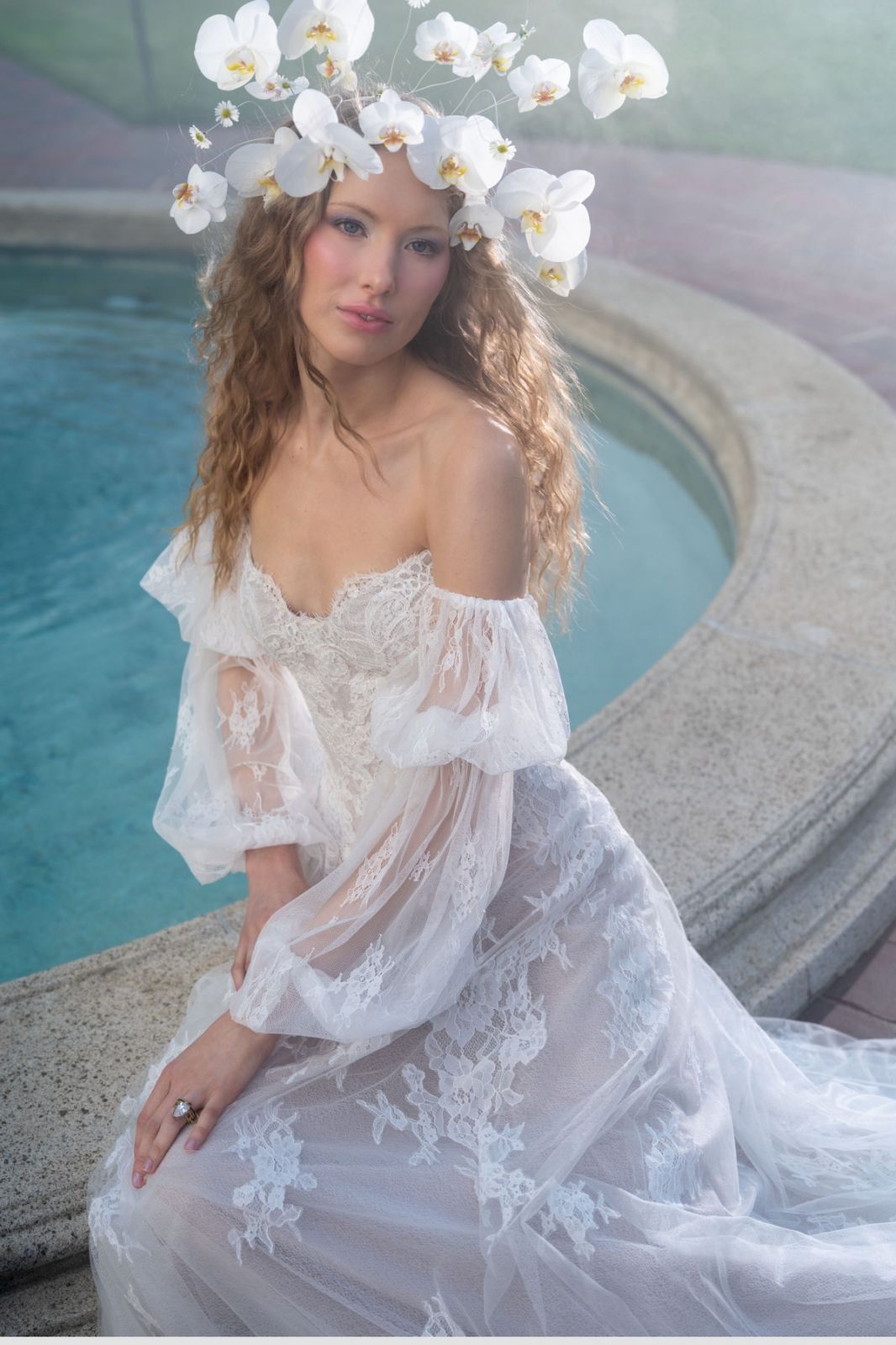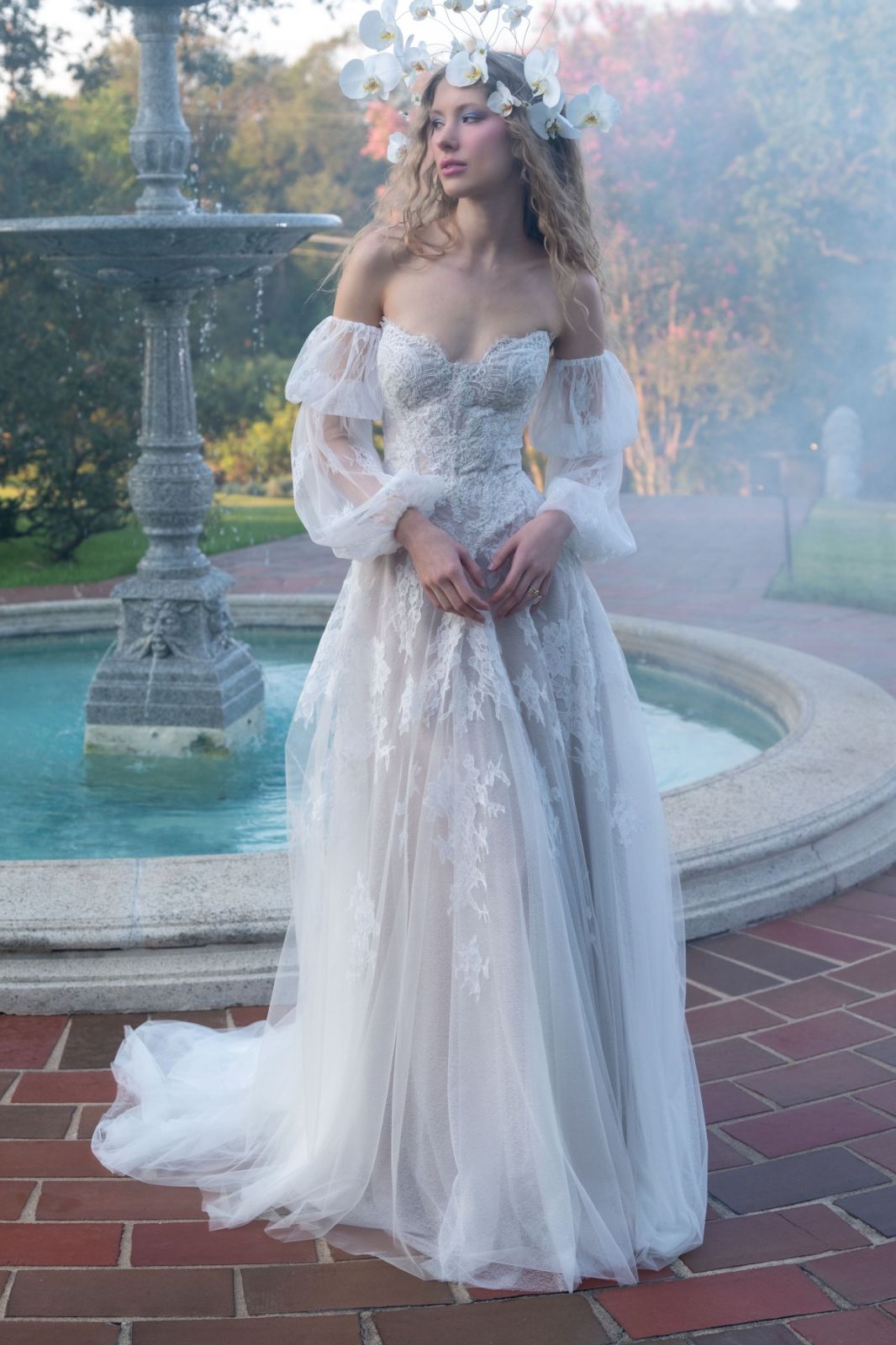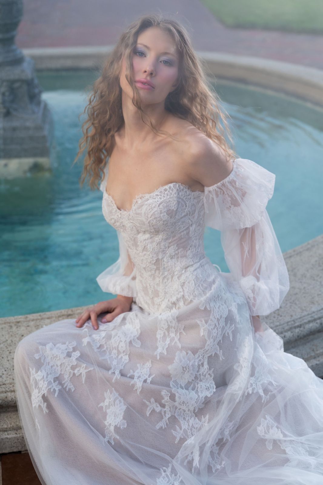 Quelques détails enchanteurs : Coupe A-line fluide qui allonge la silhouette avec naturel; Bustier off-the-shoulder rehaussé de manches bouffantes en tulle transparent, pour une touche aérienne et poétique; Dentelle florale appliquée sur l’ensemble du corsage et de la jupe, évoquant un jardin en pleine floraison; Dos lacé façon corset, à la fois sensuel et vintage; Longue traîne vaporeuse, idéale pour une entrée majestueuse.