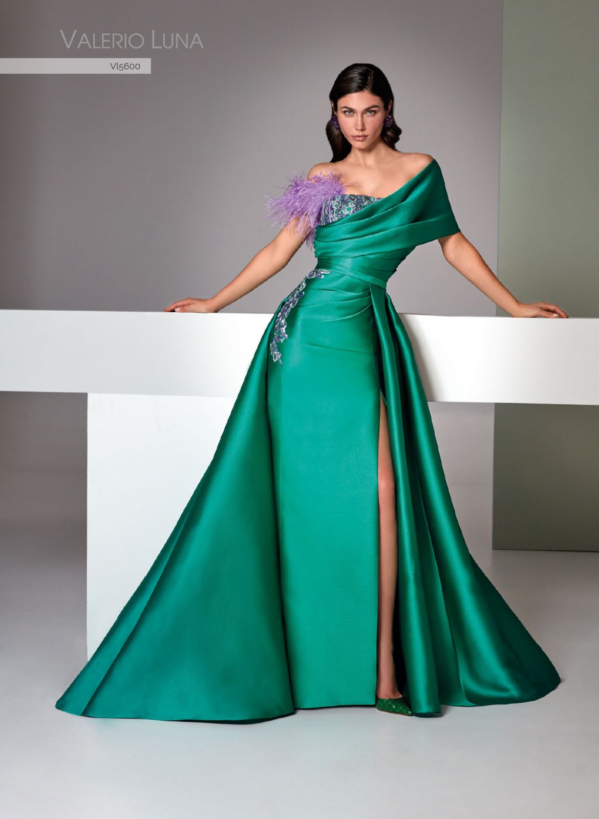 Découvrez l’audace raffinée de la robe VL5600 MIKADO de Valerio Luna, une pièce sculpturale en exclusivité chez Nicéa Mariage à Nice. Confectionnée dans un mikado vert aux teintes bleutées, cette robe de cocktail incarne la puissance du glamour contemporain. Son bustier asymétrique, rehaussé de plumes violettes et d’une broderie argentée délicate, souligne l’épaule avec majesté, tandis que la jupe fendue ou la version à traîne volumineuse offre deux interprétations spectaculaires de la féminité.