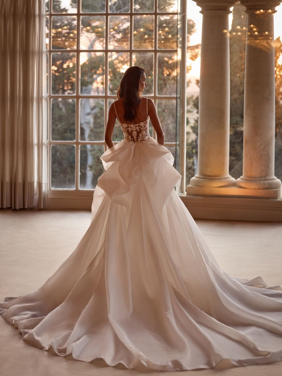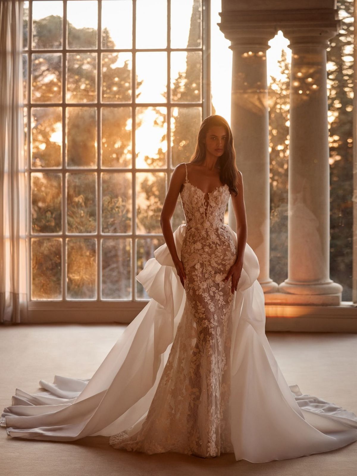 La pièce maîtresse : une surjupe amovible en organza, aérienne et majestueuse, qui transforme instantanément la silhouette. Elle permet à la mariée de jouer entre deux allures : une allure royale pour la cérémonie, puis une silhouette sirène plus sensuelle pour la soirée.